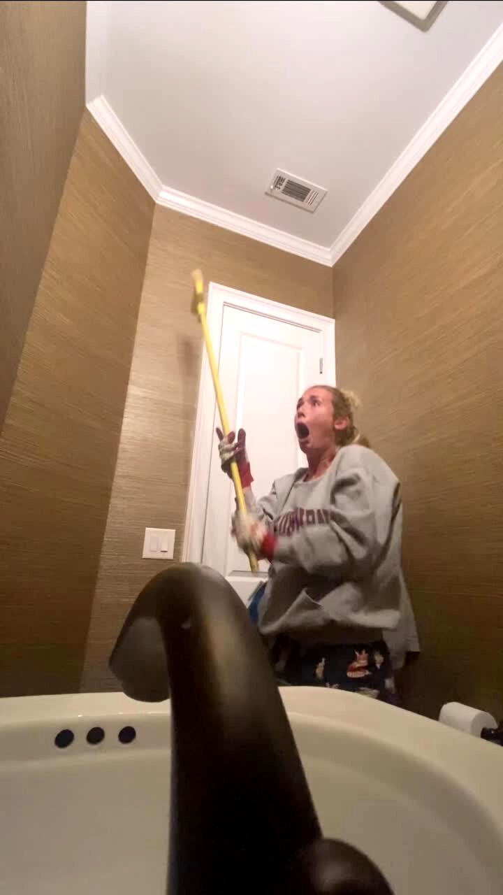 Two young women try to catch a flying squirrel with a broom in a cramped bathroom. It jumps onto the face of the woman who screams.