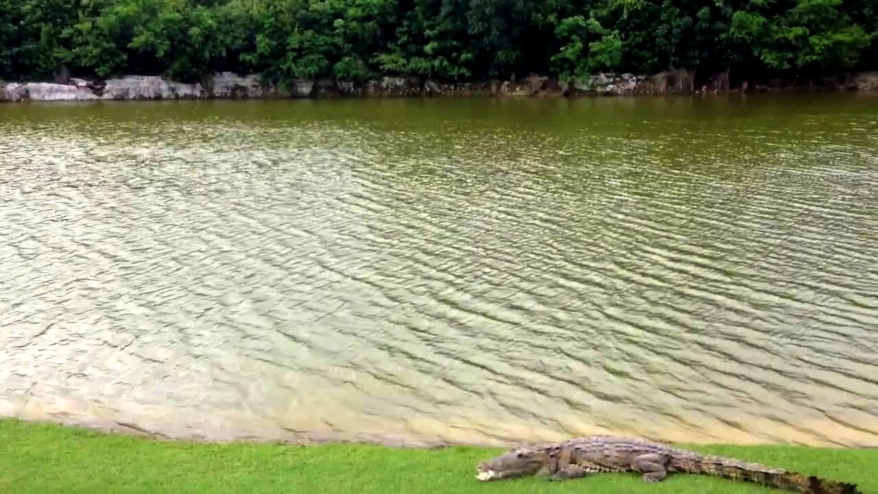 A small alligator jumps out of a pond and onto the grass to escape a larger alligator which is chasing after it. Both gators run back into the water.