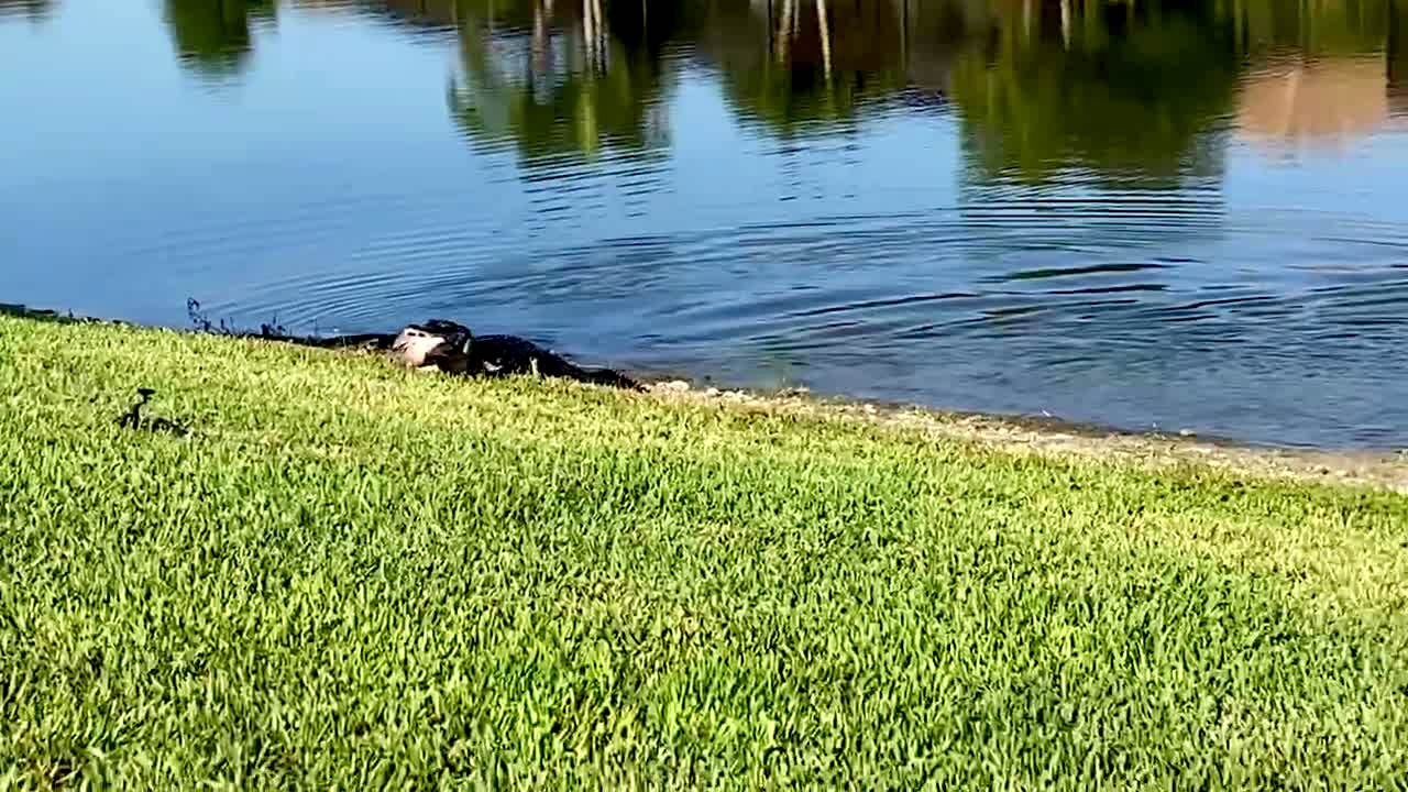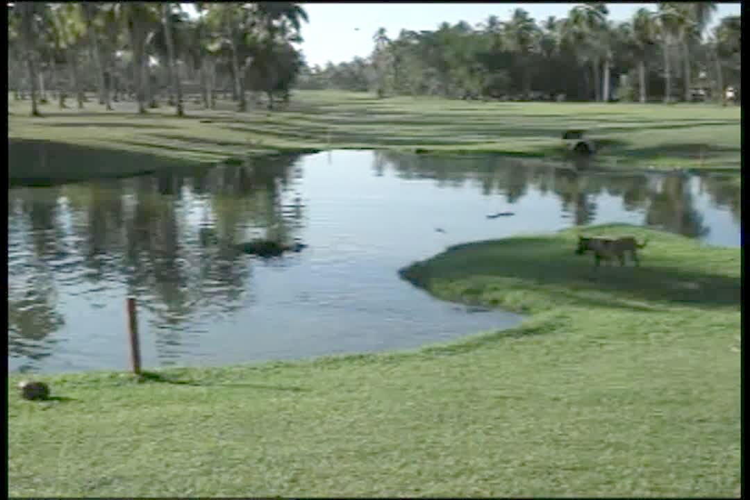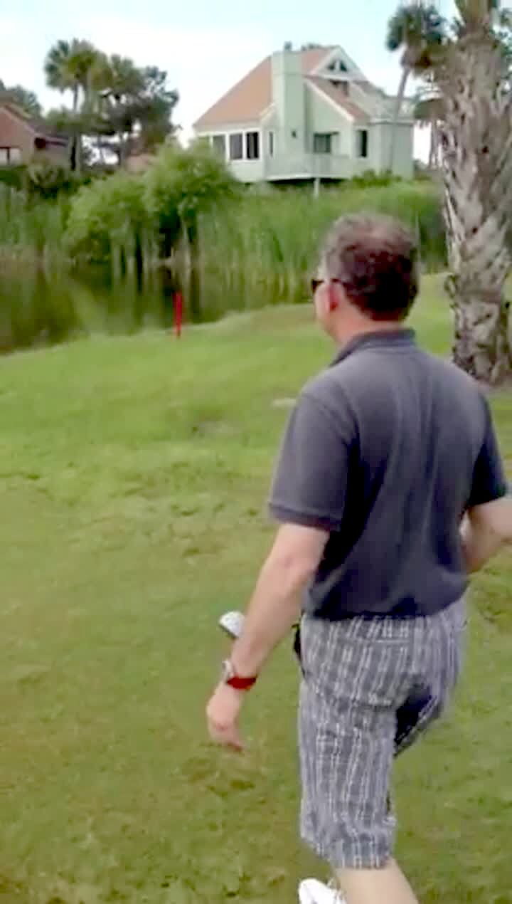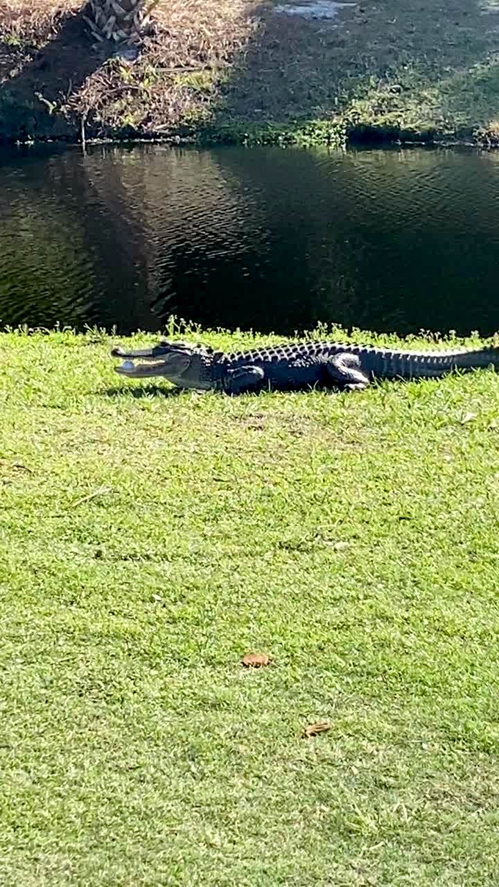 An alligator walks up to a golf ball on a golf course and picks it up in its mouth. A man says "give me my ball back," and it drops it, but it picks it up again.
