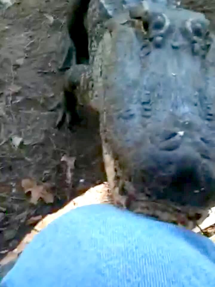A man records an alligator outdoors, and asks if it "wants a piece of" him, and the alligator opens its mouth as it moves towards him.