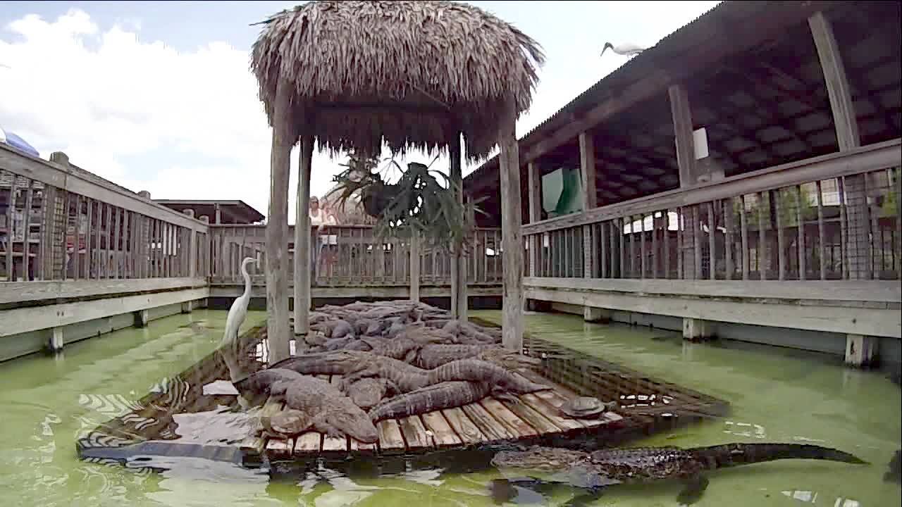 Several turtles and alligators swim in a pond habitat and one alligator follows the camera, then launches for it and bites it, gripping it in its jaws for a moment before it lets go.