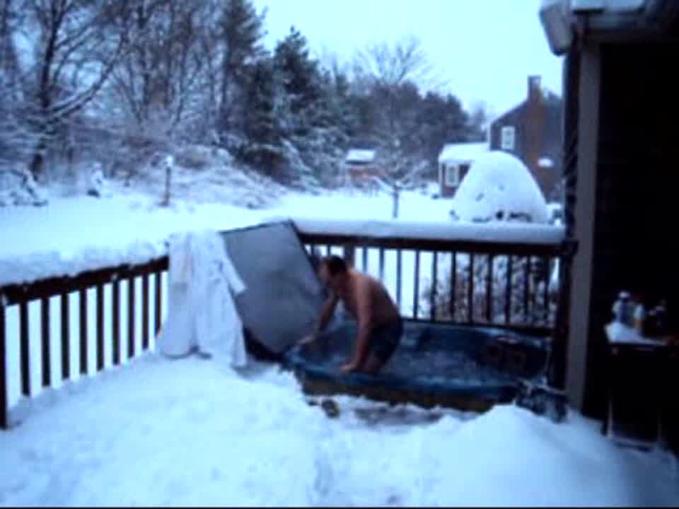 Man tries to get out of a hot tub on the patio, he slips and falls face first into the snow. he climbs right back into the jacuzzi. Bonehead.