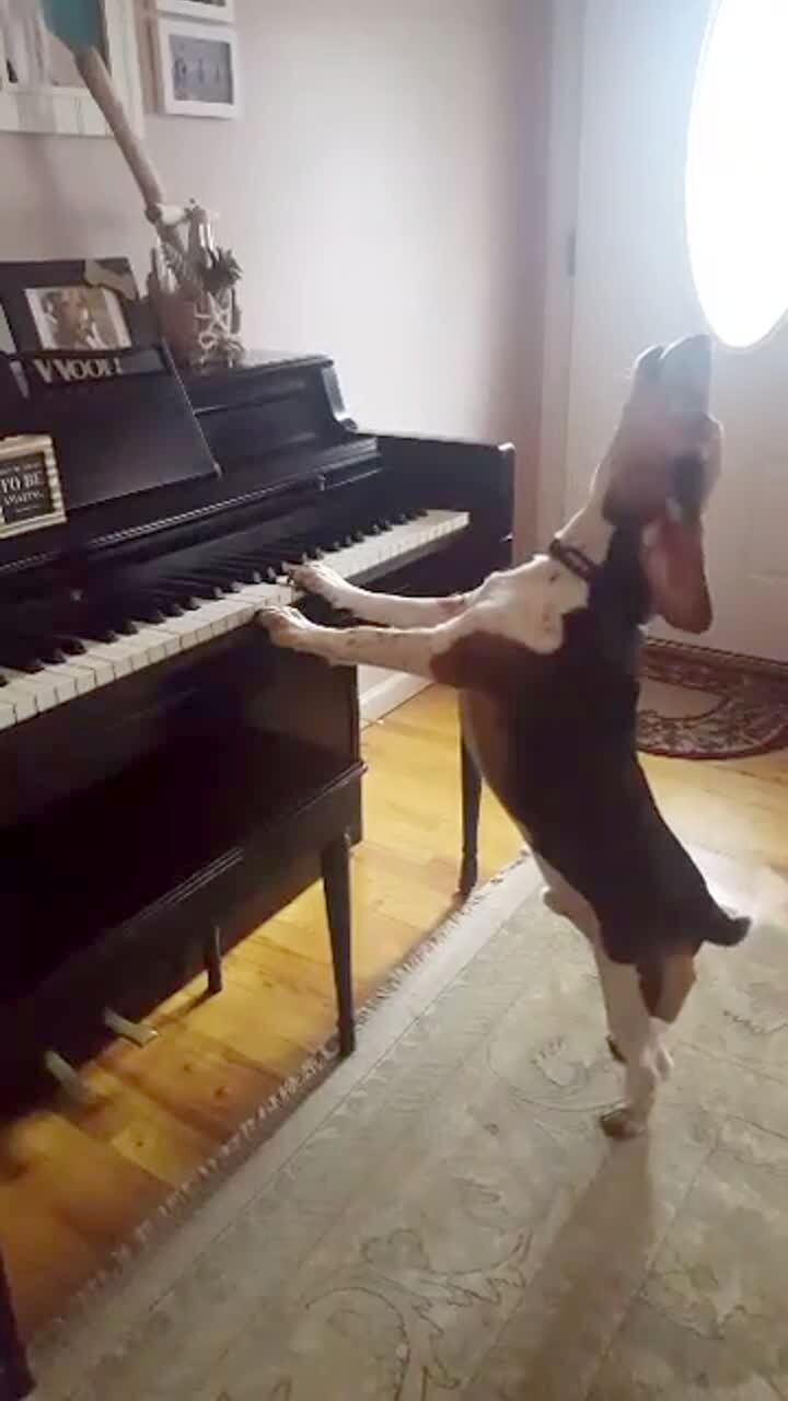 A dog jumps around in front of a toy dog that spins around and plays the Addams Family theme song.