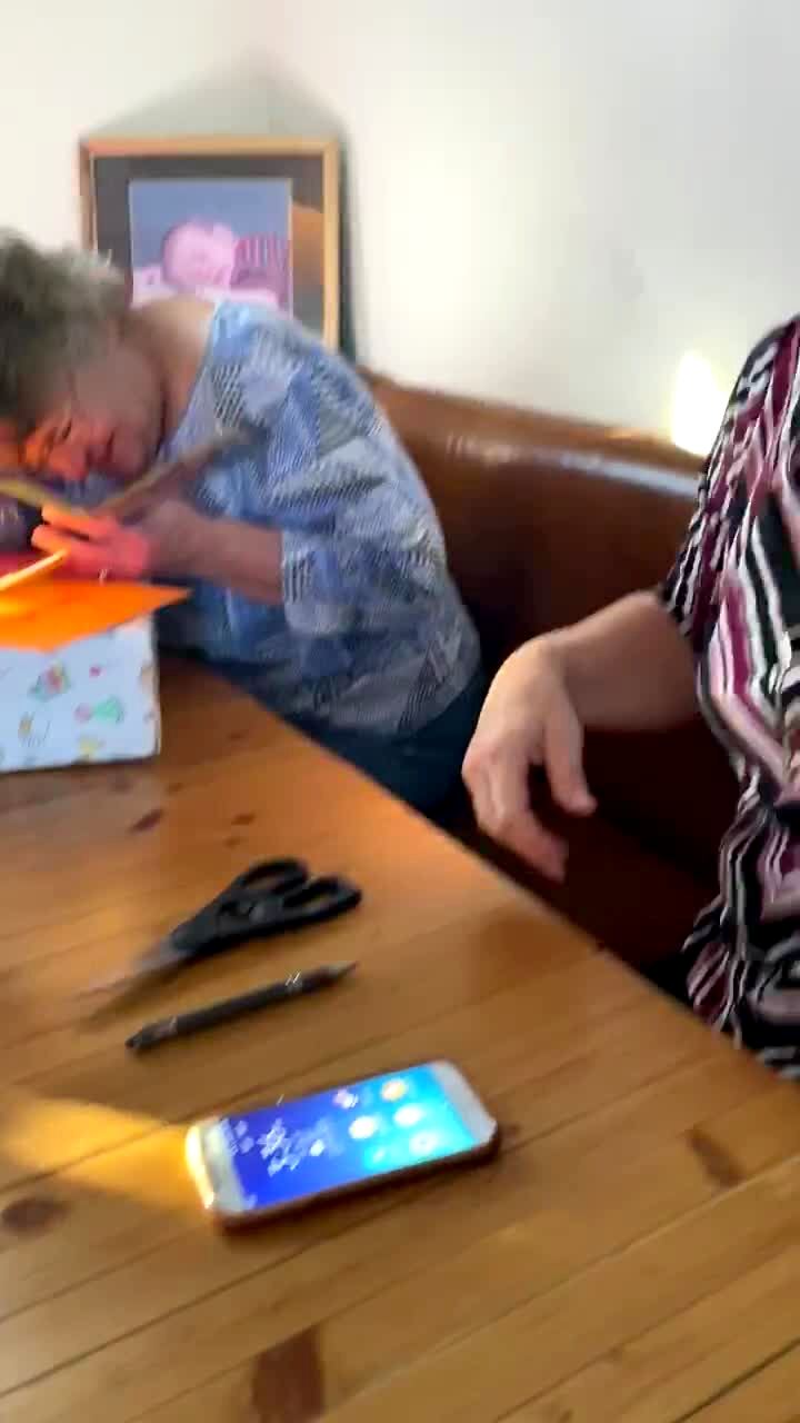 A senior woman flinches and hits her head against a wall when she opens a birthday card and it plays a song.
