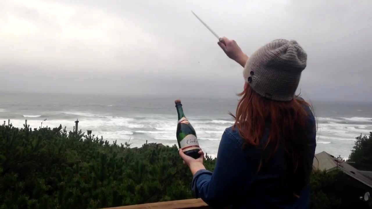 A woman on a balcony tries to open a bottle of champagne with a knife but drops the bottle several stories.
