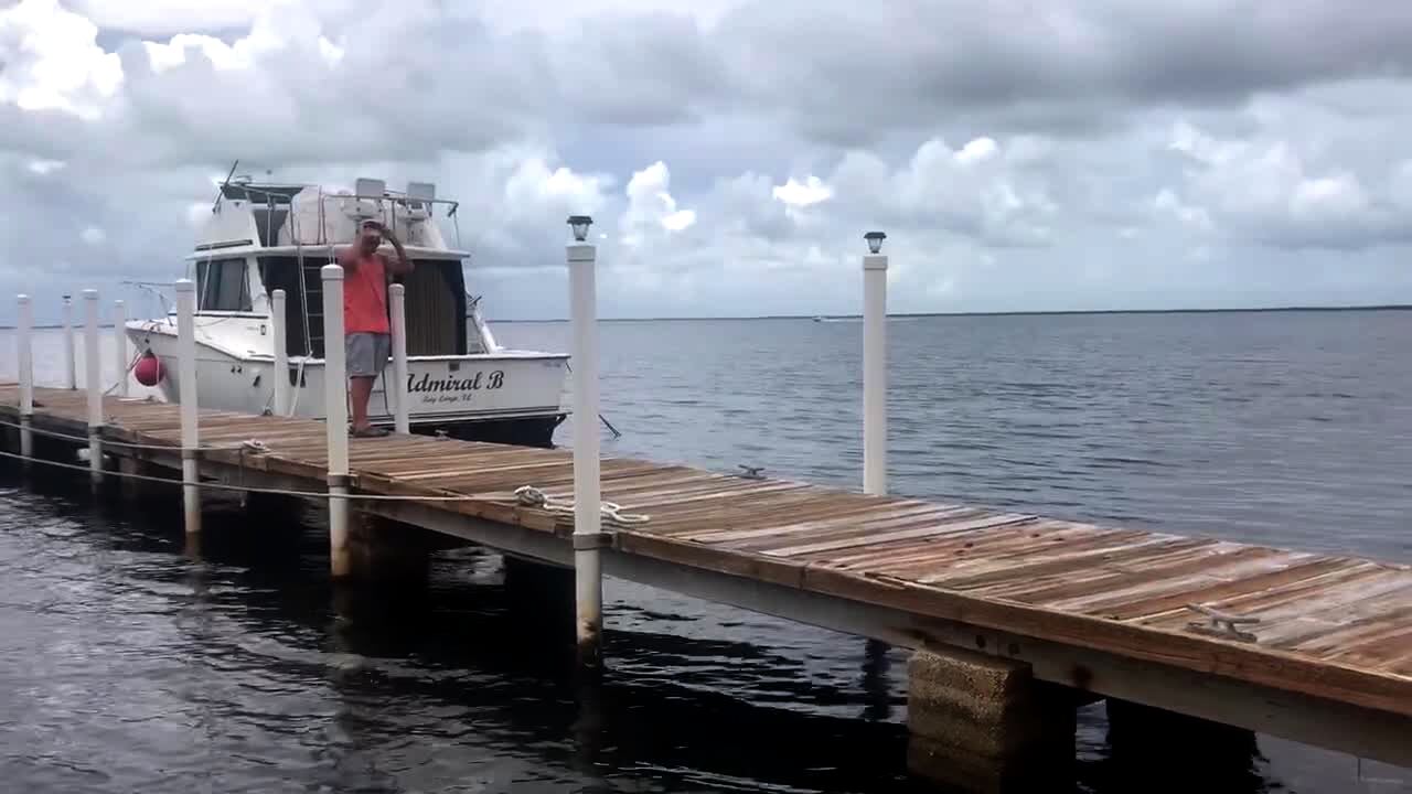 A young girl and three teen boys line up to play a game where they can see who can walk the furthest down a dock with a blindfold before they get scared and stop. The young girl takes a few steps then turns around. A teen boy goes farther then turns around. Another teen boy tries it and he crawls instead of walks and he slips and falls into the water.