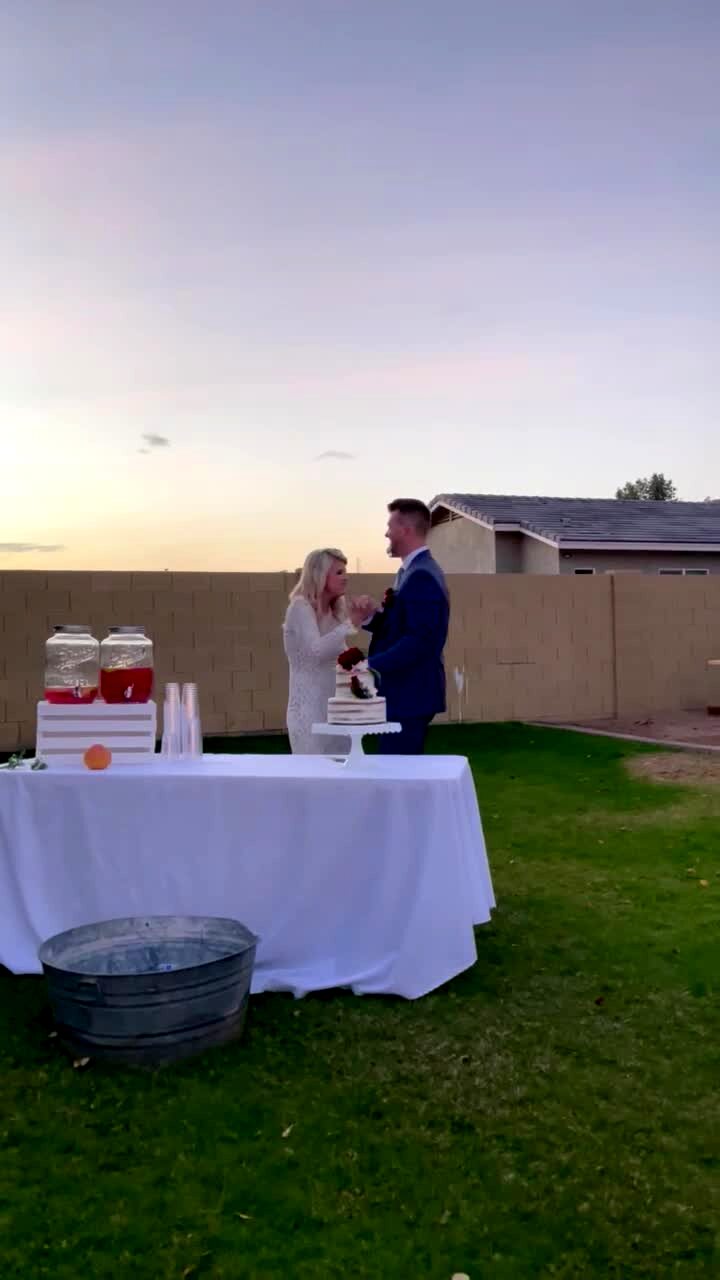 A bride and groom each throw a piece of cake in the air at a wedding in a yard and they both catch the other piece in their mouths.