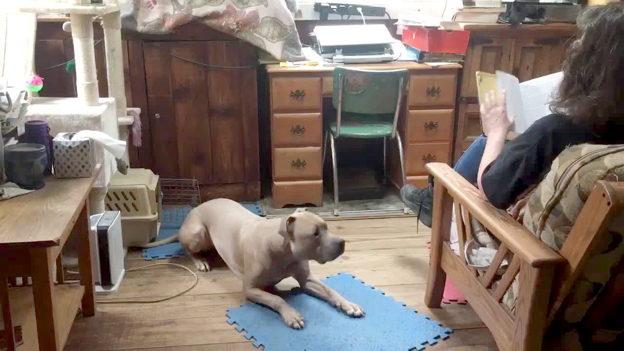 A woman sneezes in a living room and a pit bull dog grabs a tissue in its mouth and hands it to her.