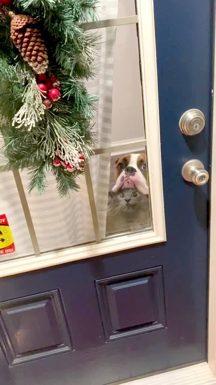 A woman hides in a doorway and screams and scares a man as he walks down a hallway.