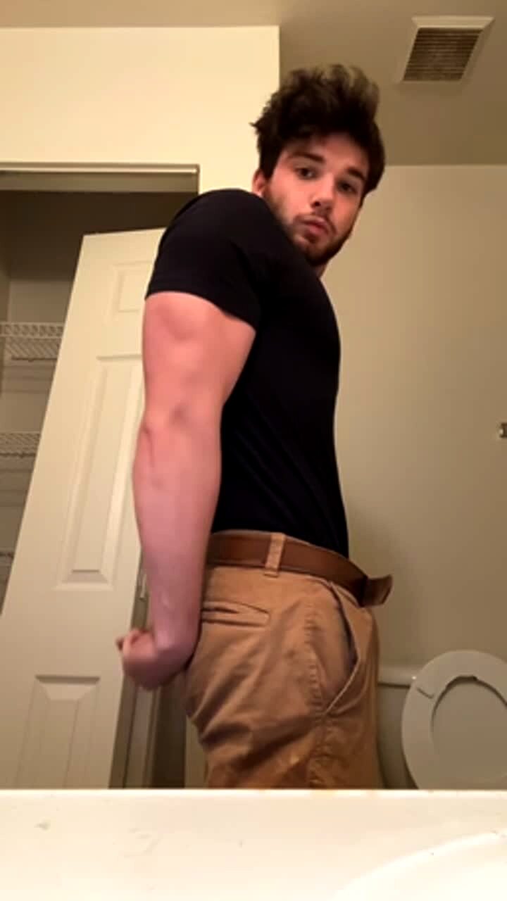 A young boy steps on an an exercise band and lifts the handles up, then the band snaps and hits him in the groin in a bedroom.