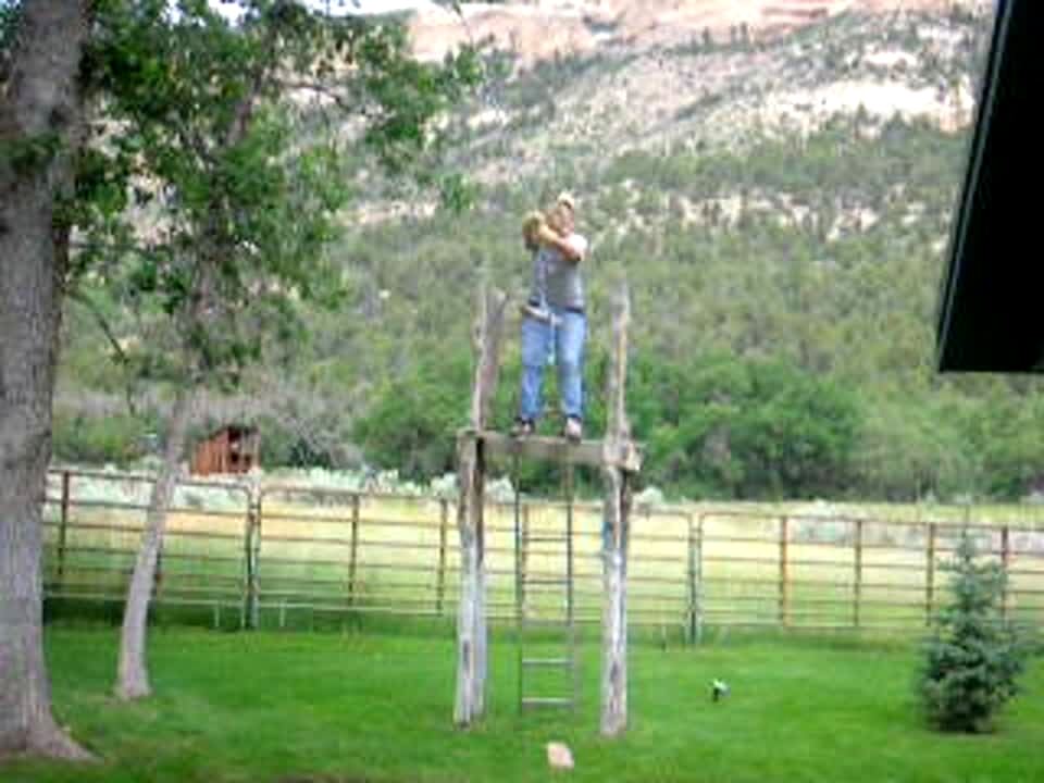 A teen girl swings from a rope swing hanging from a tree on a farm. She jumps off the platform, the rope breaks, and she falls hard on the ground. Action 30 seconds to end. No tails.