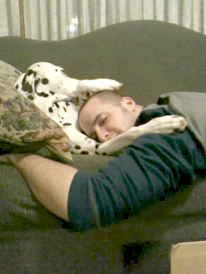 A dalmation dog lies on a couch and lets a man lie with him. The dog stroke the top of the man's head lovingly. Cute.