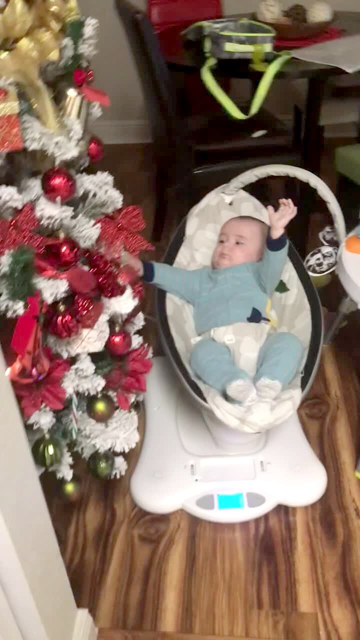 A baby boy in a living room sits in a swinging seat and reaches out and grabs a Christmas tree and pulls it down on top of him and his mom runs forward to catch it and lift it off him.