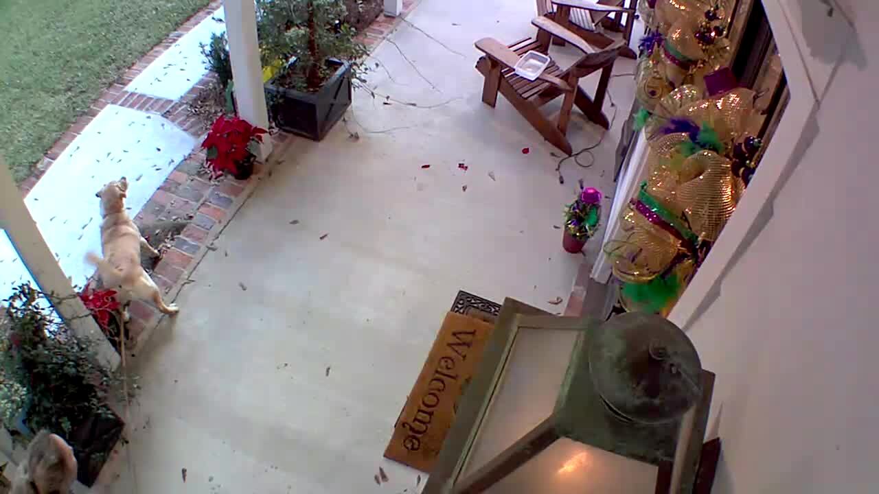 A dog attacks a package on a porch and carries it into the yard and tears the cardboard box apart.