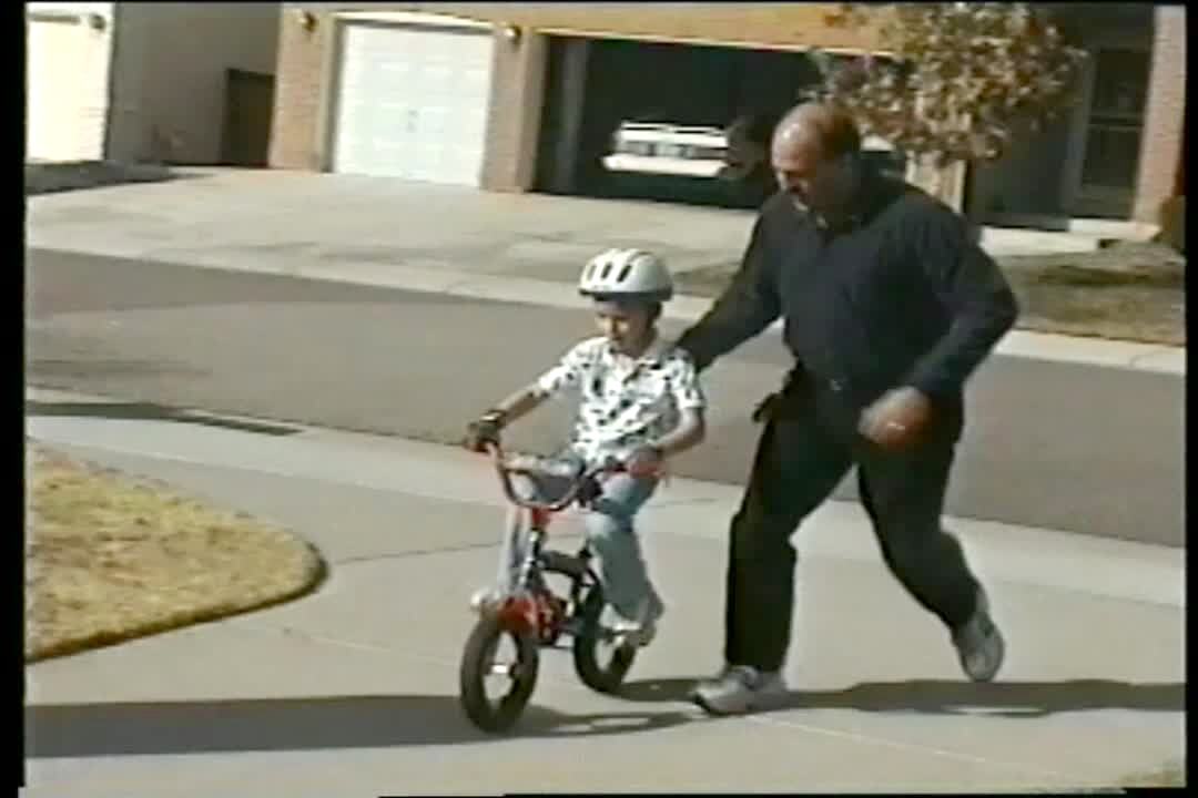 Boy learns to ride bicycle, his mom helps him. Boy falls gently and says "Ow my weenie." They should make weenie pads now." Kids say.