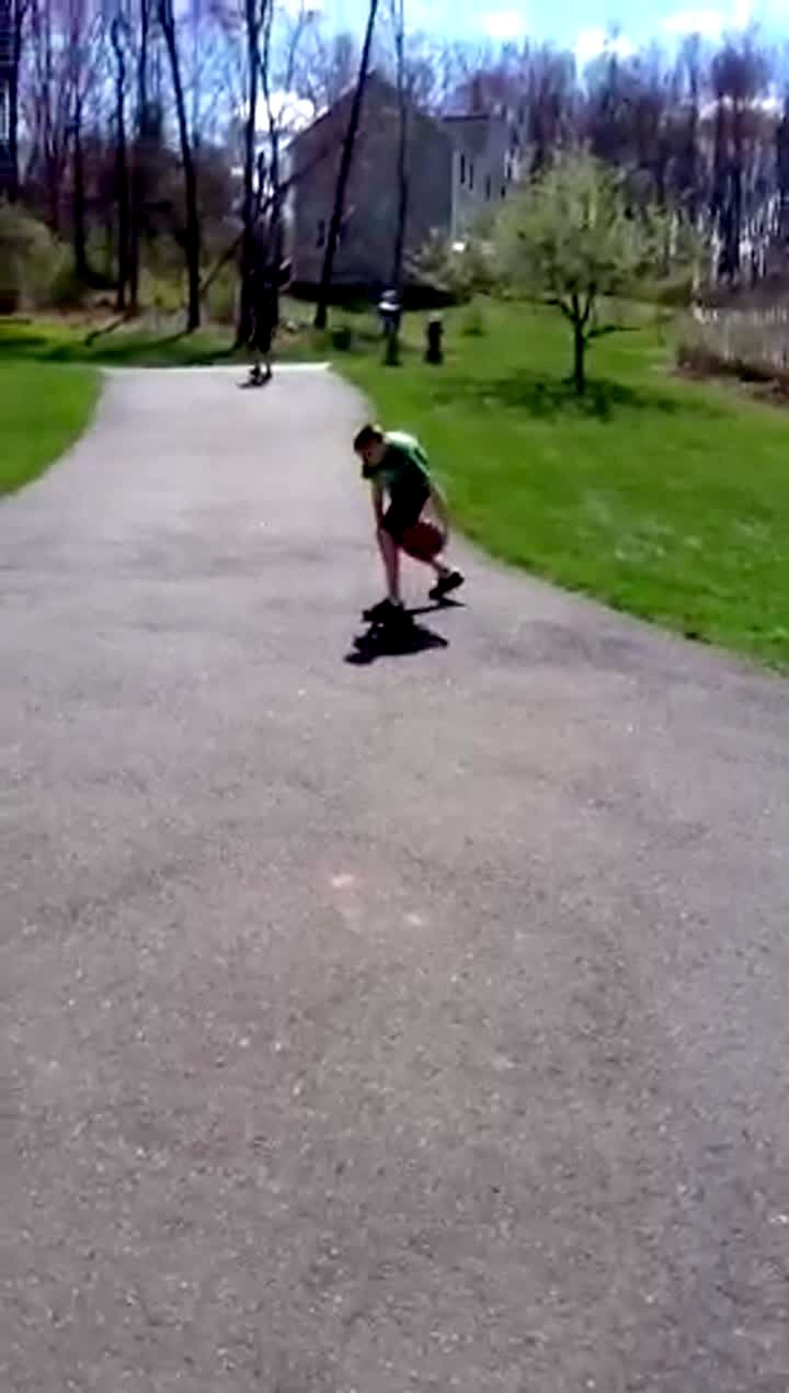 Boy slam dunks basketball into net in driveway, tries to hang upside down from the hoop, it breaks. Camera misses the fall but catches recovery.