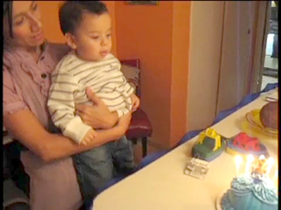 Woman holds tot boy while man sings Happy Birthday to the tune of Jingle Bells. When man sings HB the normal way, boy cries.