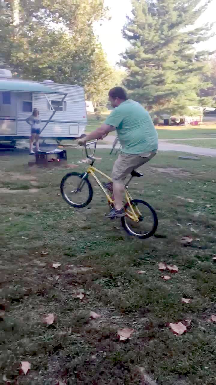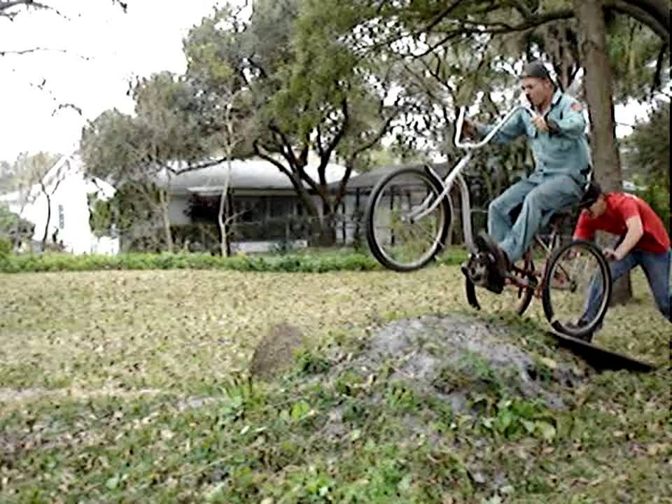 Man rides a bike & tries to pop a wheelie, the handlebars break off when he tries to pull them up. Man falls down. Good recovery.
