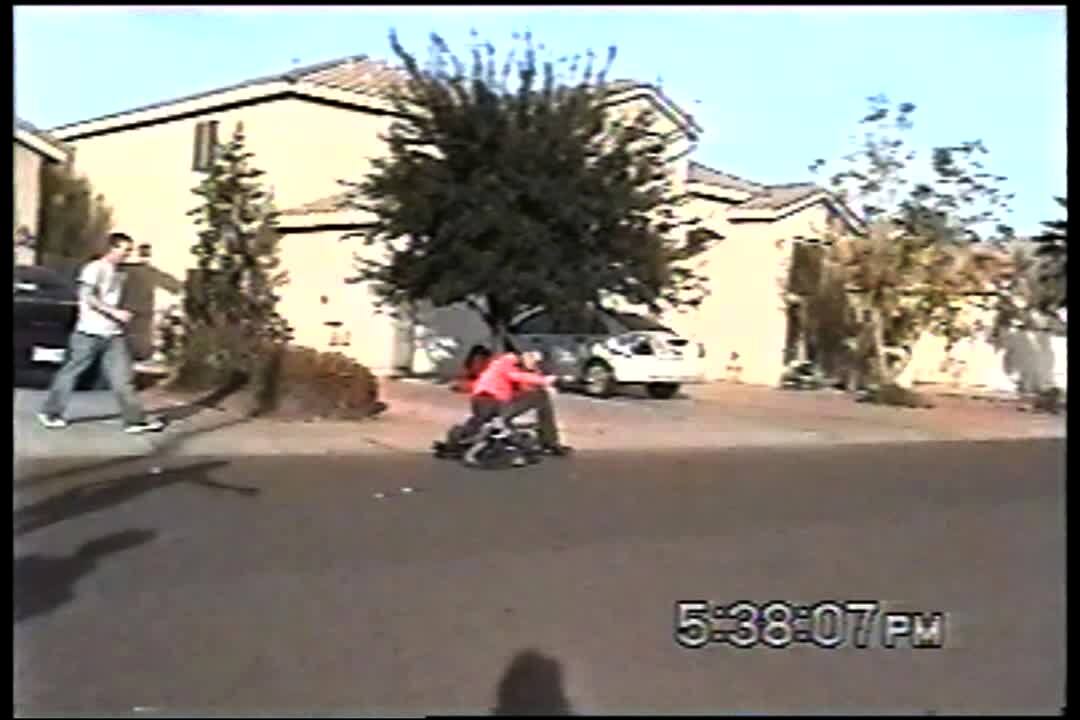 A man falls off a dirt-bike and holds onto the handlebars as it spins in circles around him as he lays on the ground in a front yard. Short head. Home security camera video, no audio.