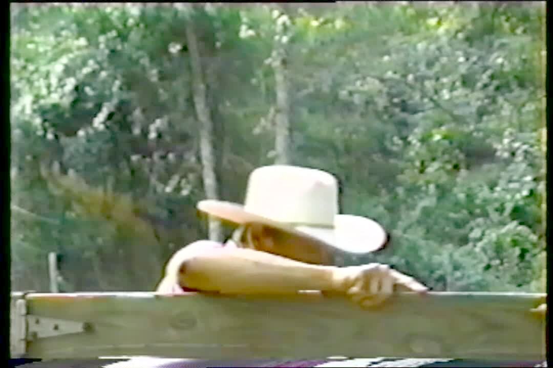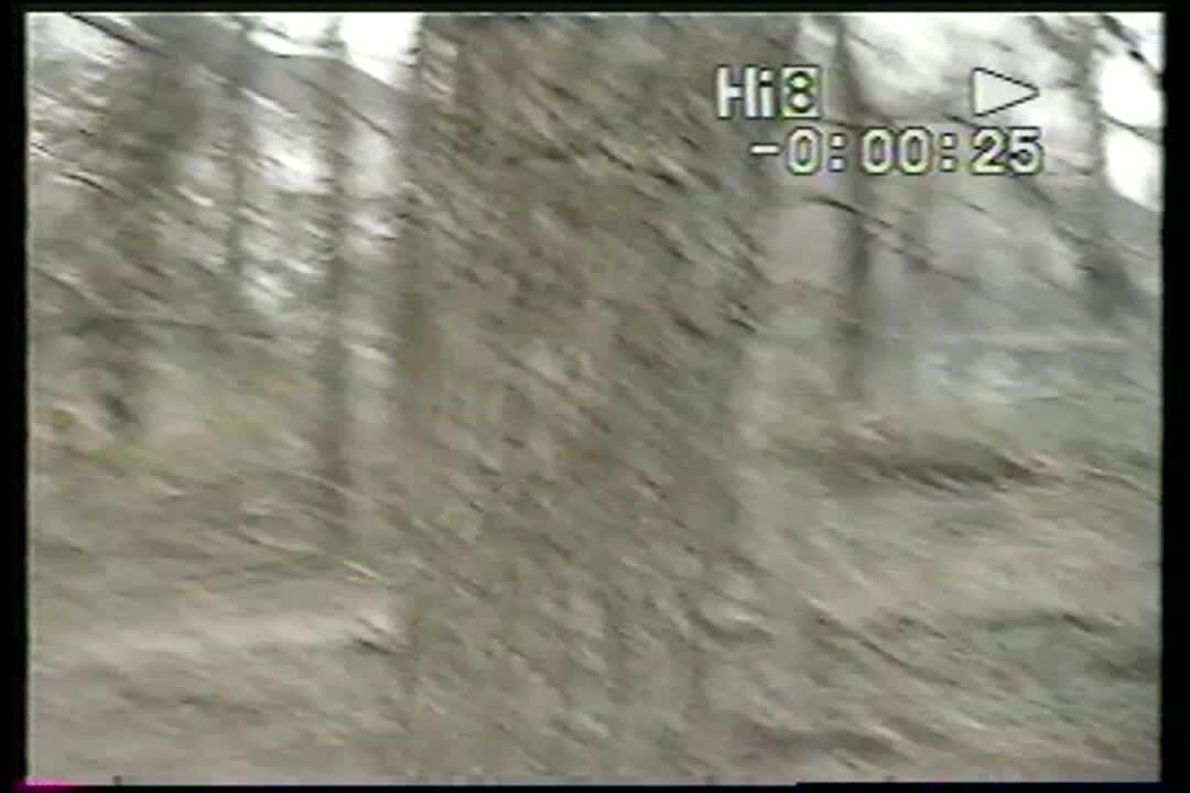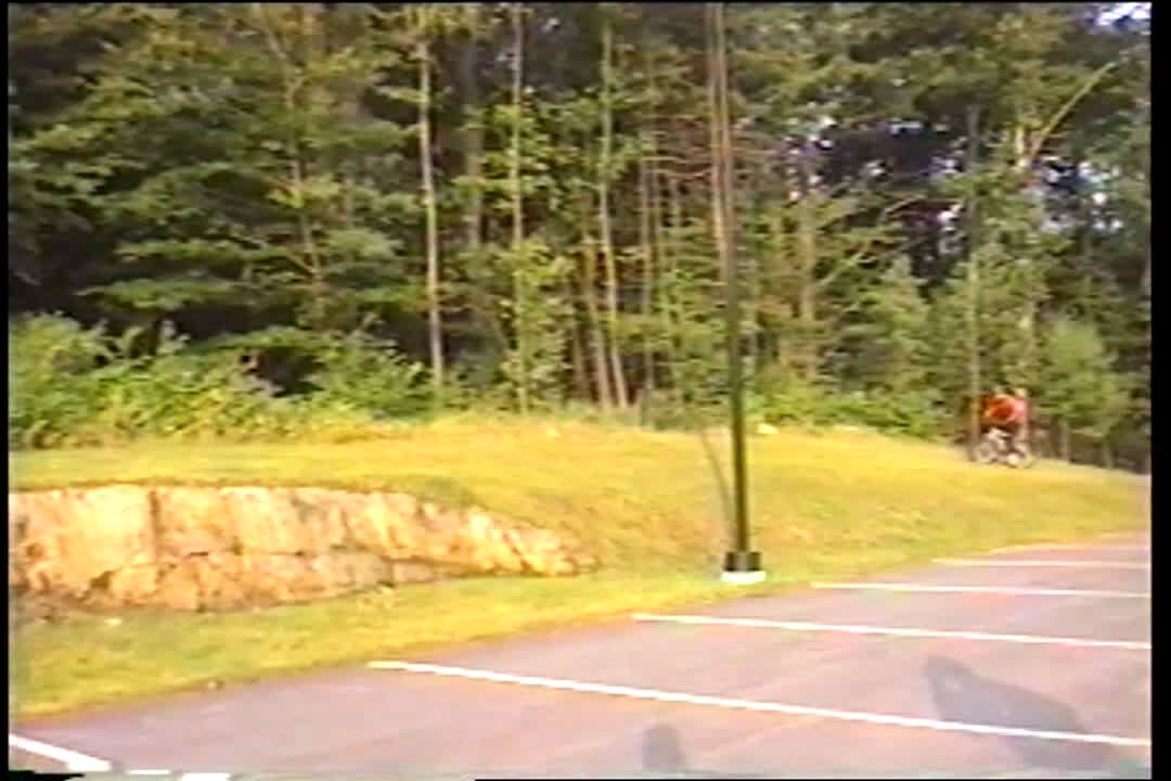 Man rides bike / bicycle up ramp and over tires. He falls off of bike and lands in the grass. No tail. (2103)