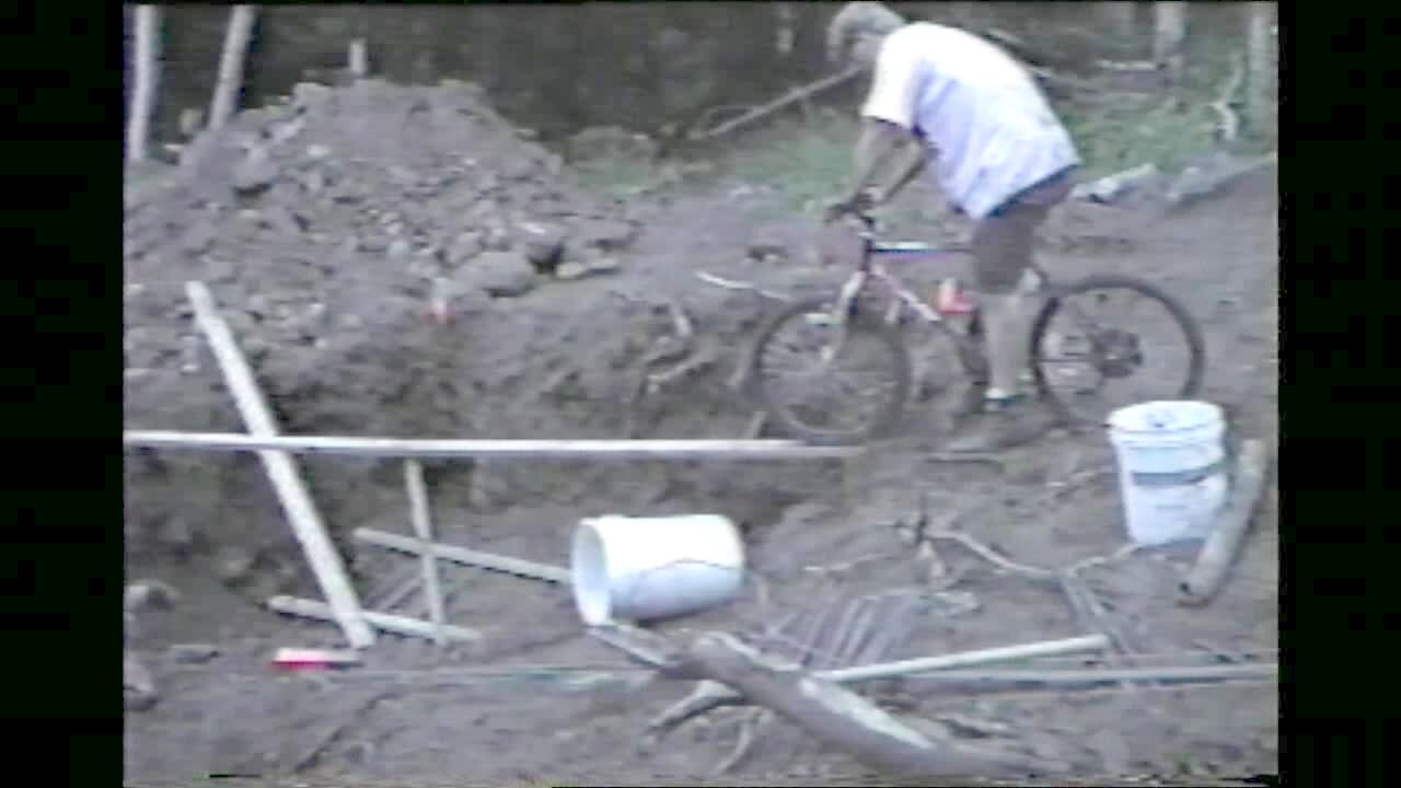 Bonehead man on bike tries to ride thin board over mud hole - falls in