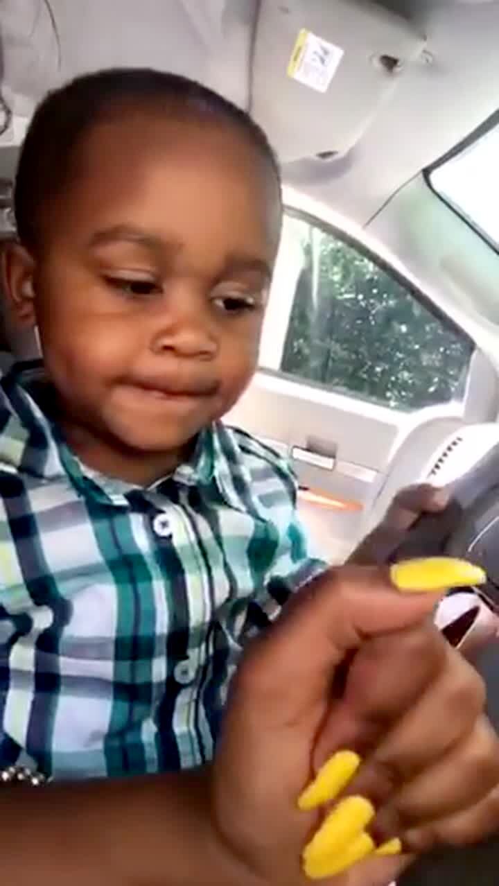 A woman tells her tot son to blow the horn as they sit in a car and he blows air on to the steering wheel. She then presses his hand into the wheel to honk the horn.