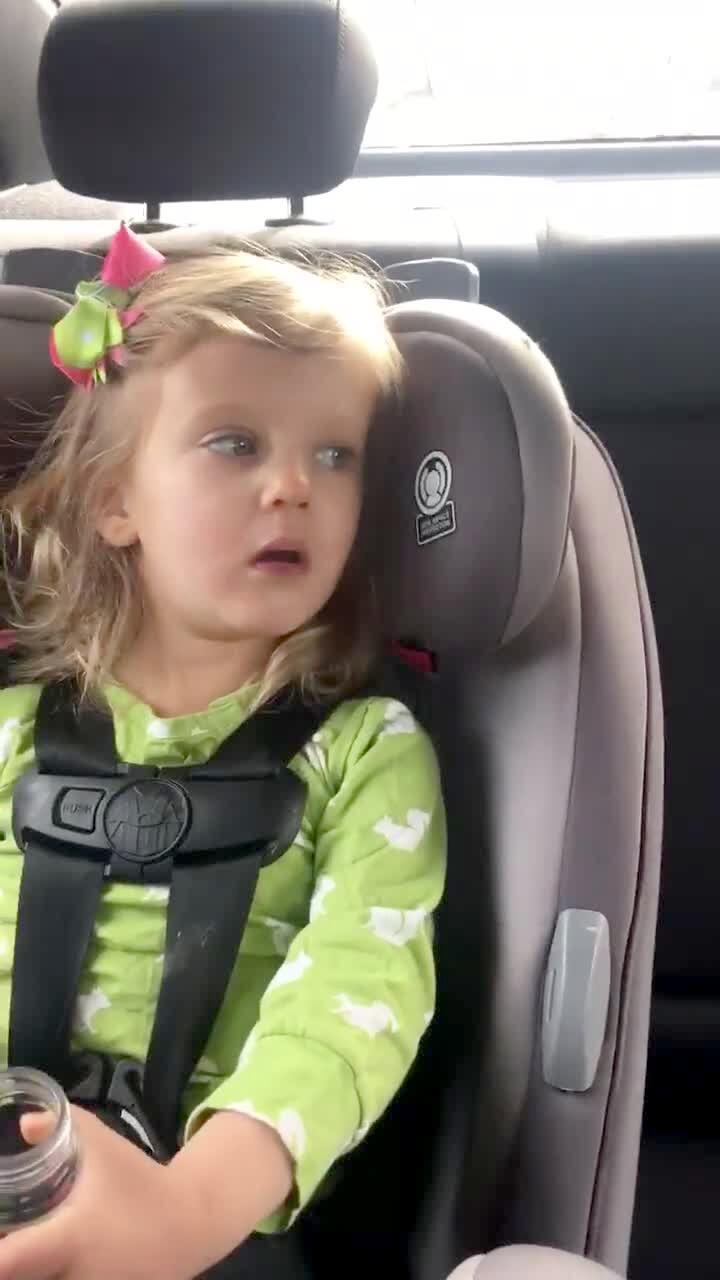 A woman lip syncs to her daughter throwing a temper tantrum in a car.
