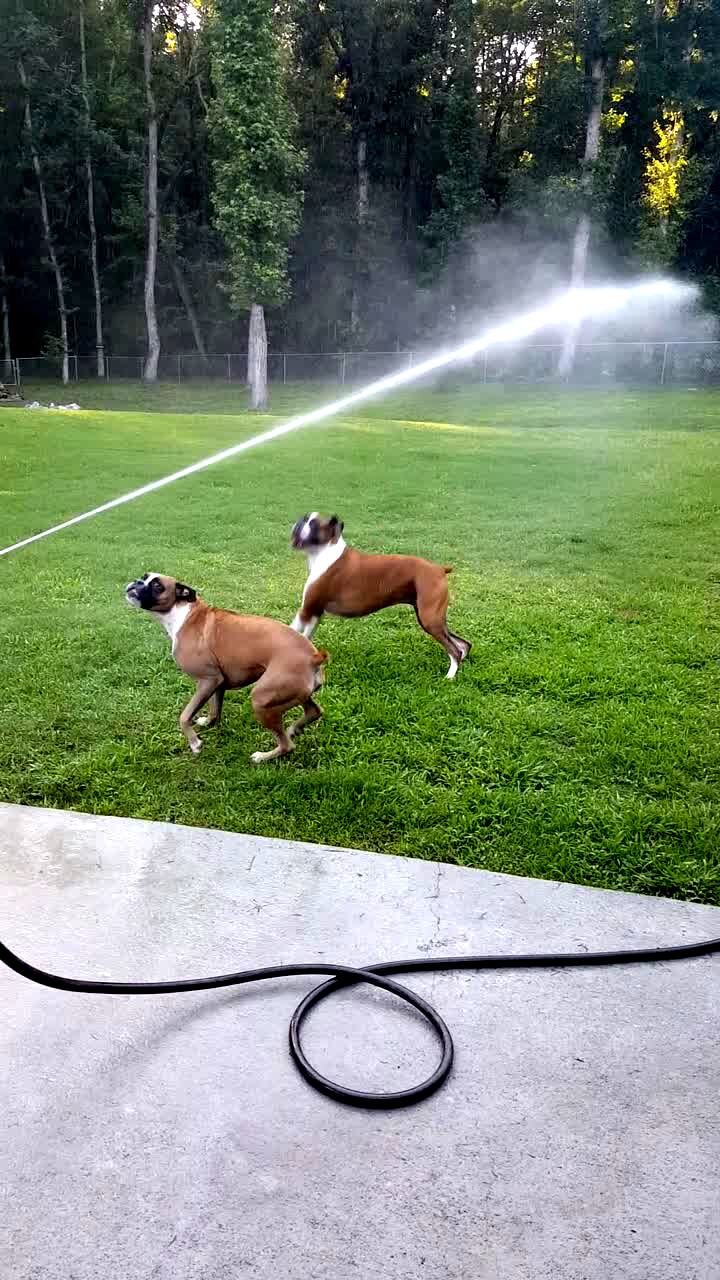 Two Boxer dogs jump and bite at water from a garden hose.