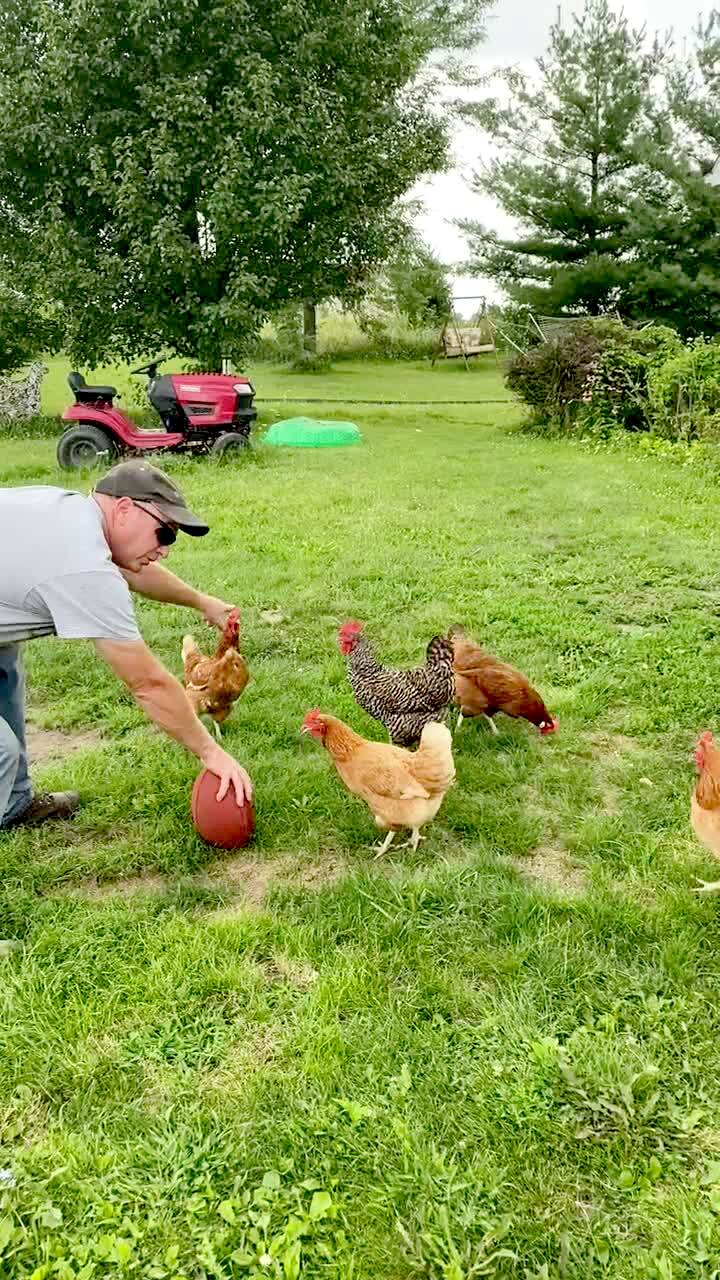 A man tries to teach chickens how to play football then throws the ball and chickens run after the ball in the yard.