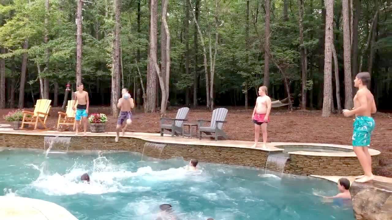 A large group of young boys throw a basketball to each other as they jump into the swimming pool. They pass it around until one boy shoots it into the hoop from a distance.