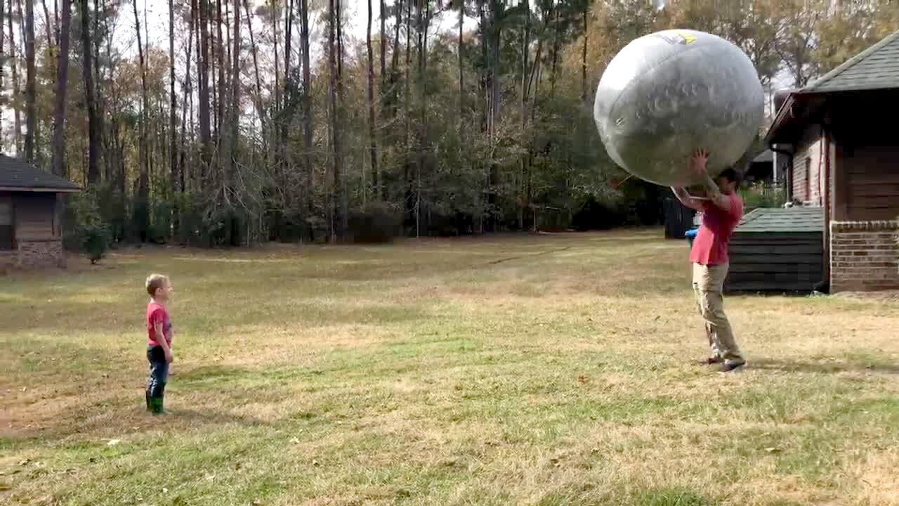 A man throws a giant inflatable ball at a tot boy and knocks him over in the backyard.