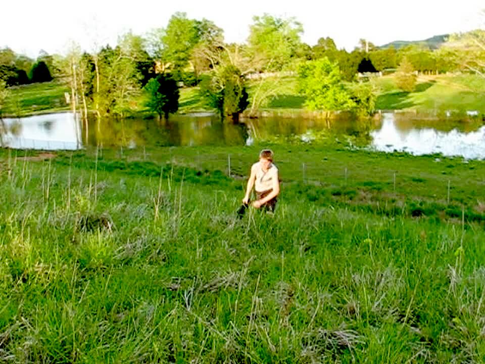 A teen boy chases a baby goose until it stops running. An adult goose flies at the boy and pecks the camera.