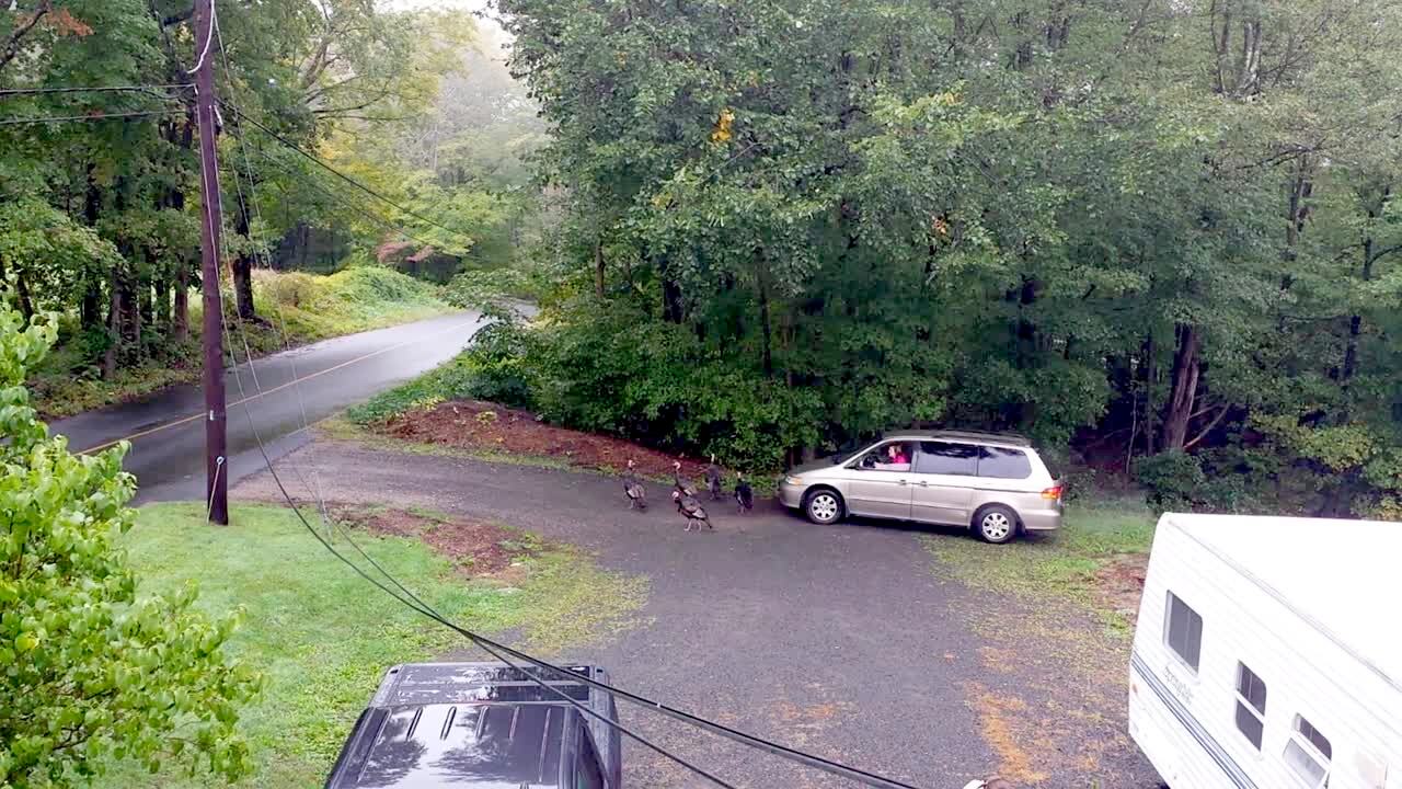 wild turkeys walk near and up to camera, then start pecking at and chasing cameraman. Terrible job filming during attack. "The Blair Turkey Project."