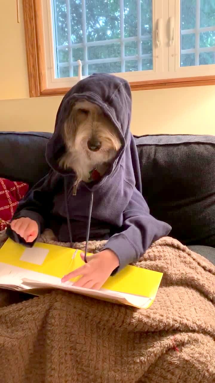 A dog with human hands plays video games on a living room couch. A man off screen yells that he needs to stop and do homework and the dog pulls out a notebook and writes. At the end the dog answers a call on a phone.