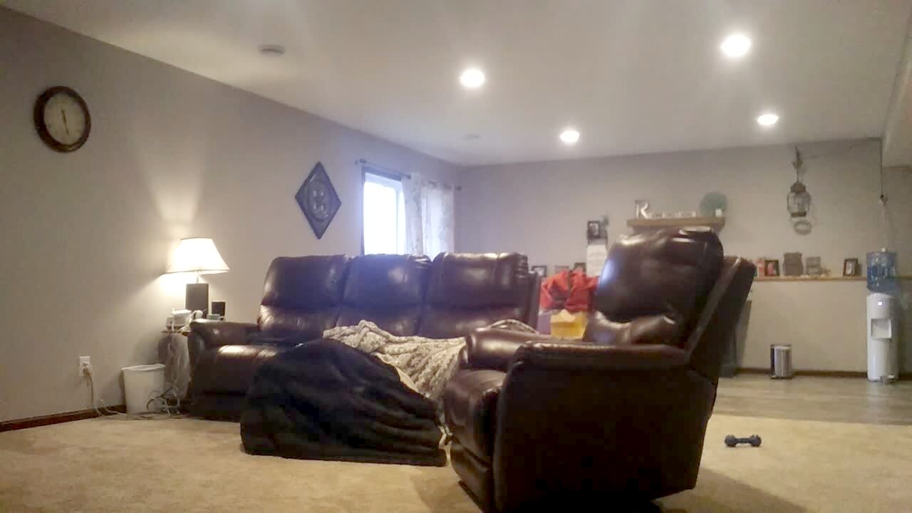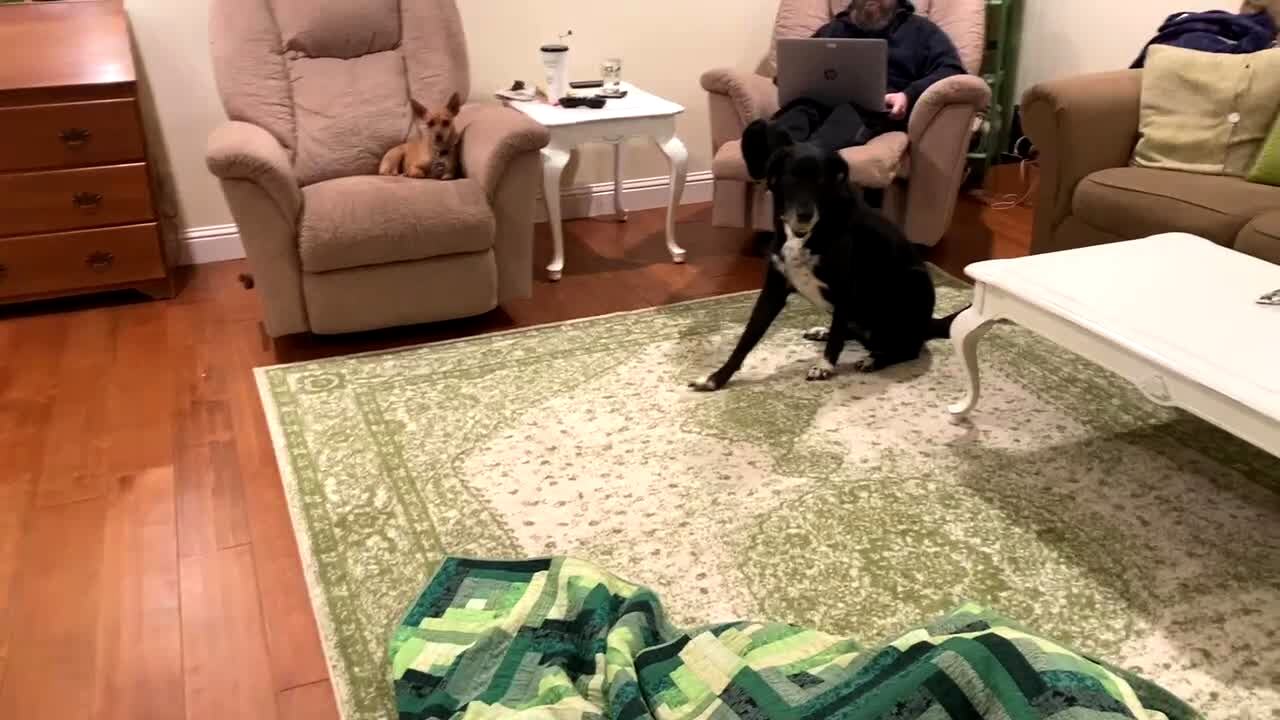 A woman does the disappearing human trick with her dog in the living room. The dog looks around the room for her, then barks when he smells her underneath the blanket.Disappearing Human Trick