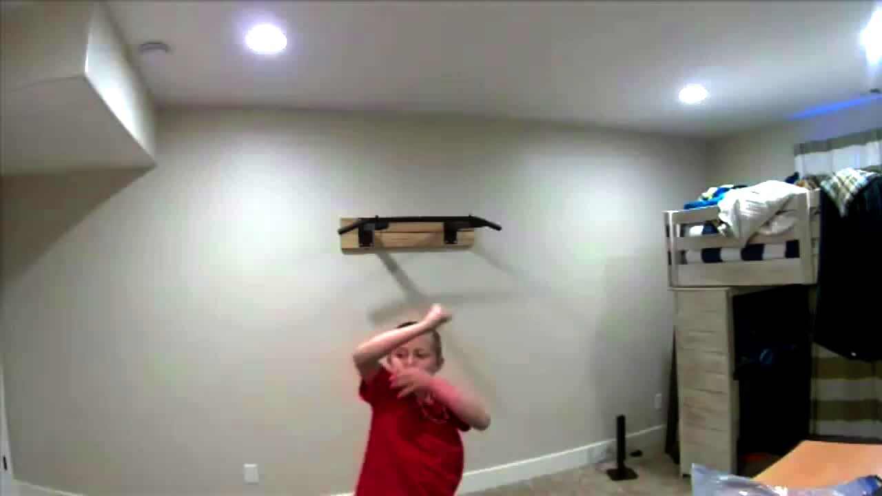 A boy flexes after he does pull-ups on a pull-up bar in the bedroom. He jumps up and grabs the bar again, but it breaks off the wall and he falls on the floor. Home security camera
