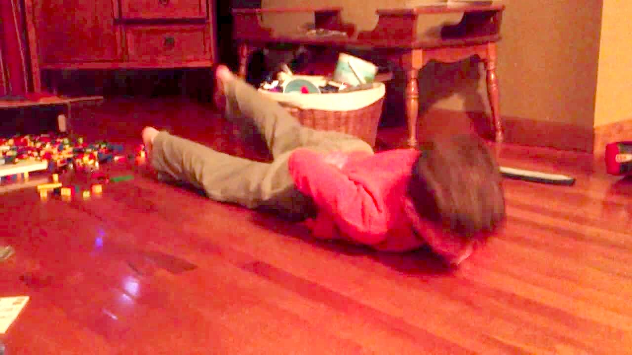 A little boy tries to do one arm push ups indoors and falls, hitting his head on the hardwood floor. He laughs. Short head and tail.
