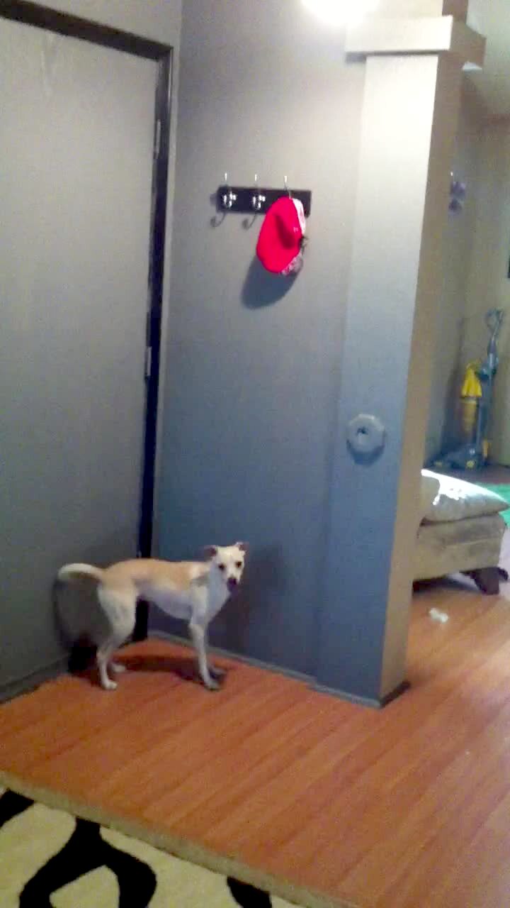 A small dog repeatedly jumps while trying to pull a red hat off of a mounted rack. The dog grabs the hat and pulls the rack off of the wall. Short tail.