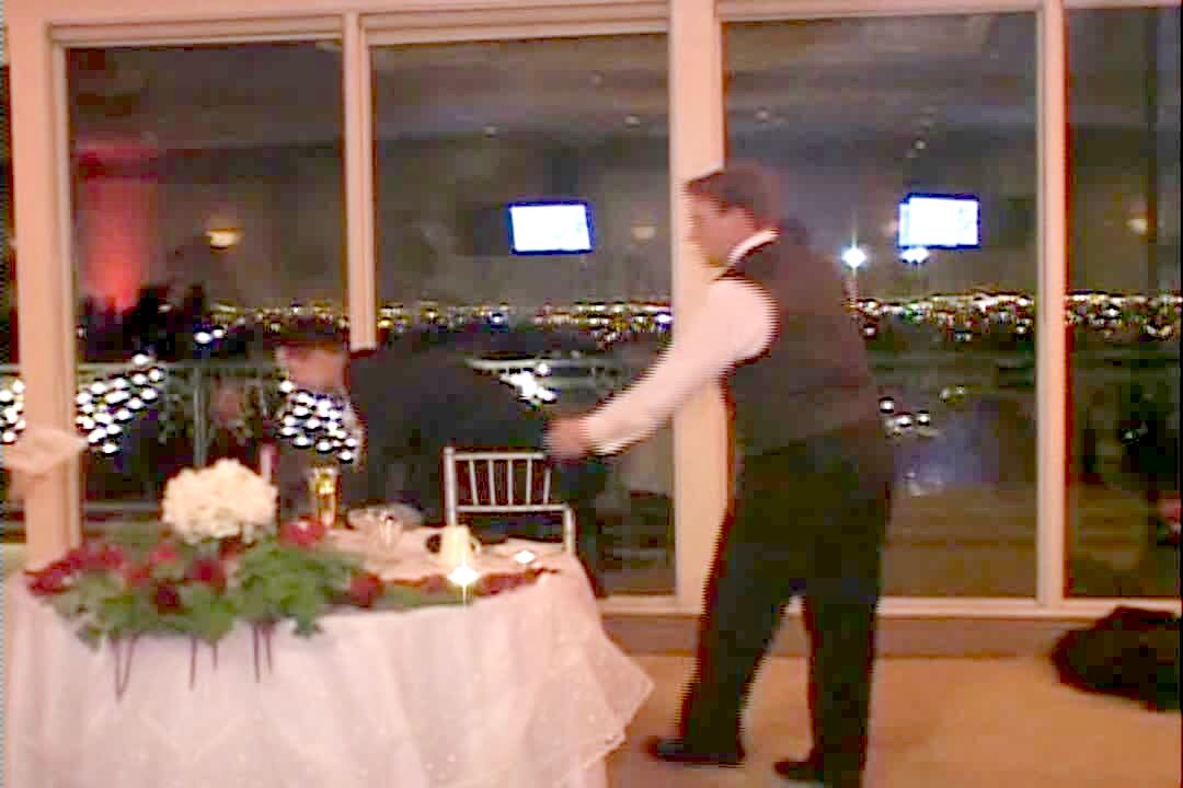 Bride gets up to kiss a guest who just gave a speech, but she falls when she tries to sit back down. Wedding reception. With recovery.