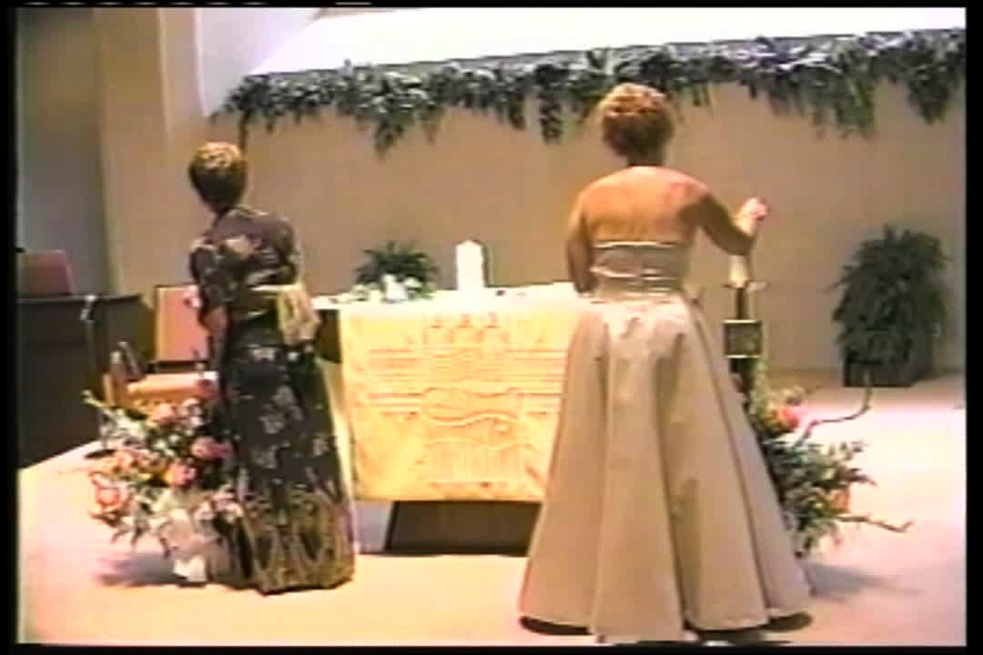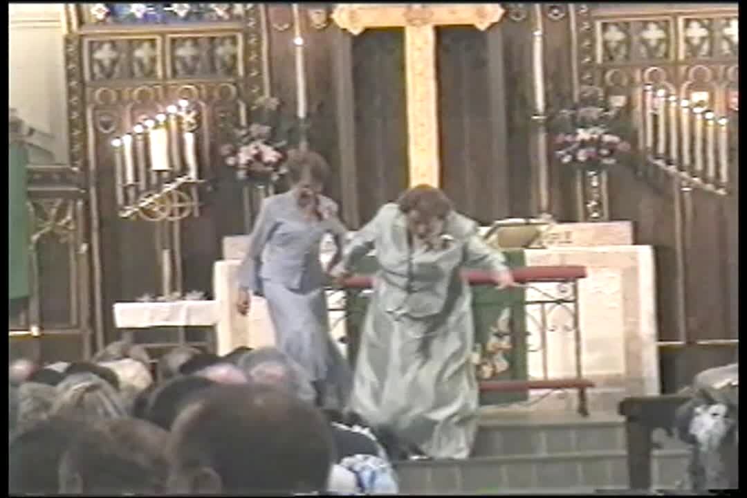 The mothers of the bride & groom fall down after lighting candles during the ceremony. 1 woman trips & pulls the other down. They stand up & take a bow. Wedding.