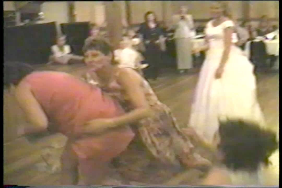 Woman pulls another woman down while trying to catch the bouquet at a wedding reception. Woman looks mad.