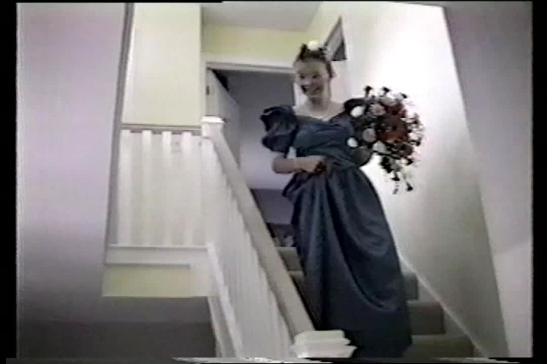 A bride throws her bouquet in a swimming pool and three women jump in after it. One gets it and raises it into the air at :25. Another shows the camera her bloody knee at :49.