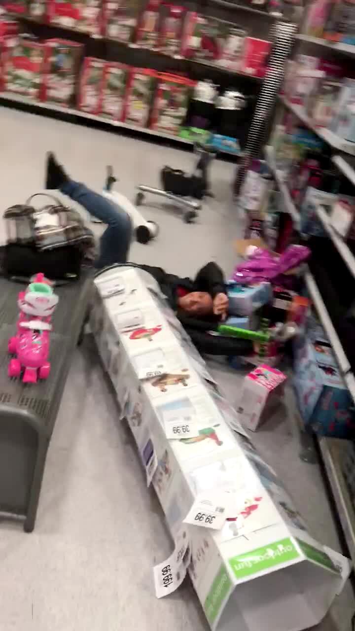 A dog hits a woman with a stuffed toy repeatedly and barks at her while she is lying on the floor using her phone. Security footage.