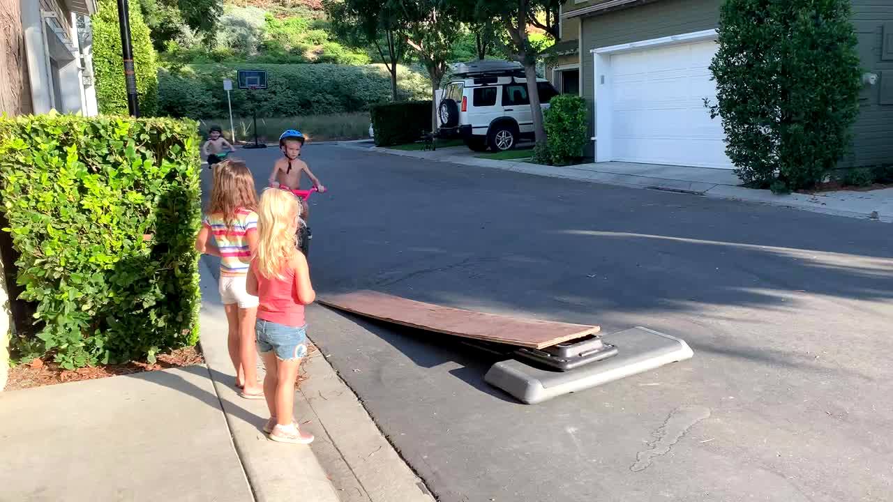 A young girl falls off a slide in the backyard when a teen boy kicks an exercise ball and it hits her in the face.