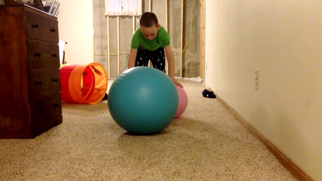 A boy tries to run and roll over two exercise balls at home and falls off sideways.