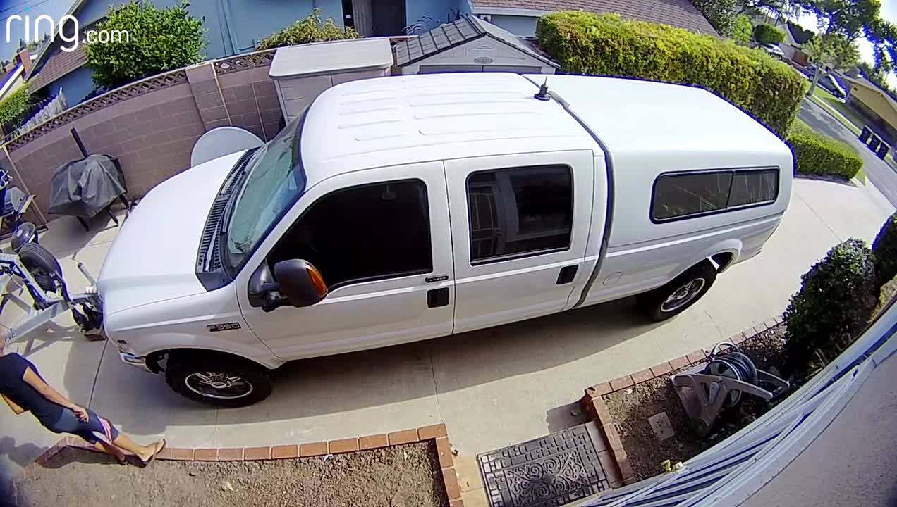 A woman slips and falls as she gets out of a truck on the driveway. Security footage.
