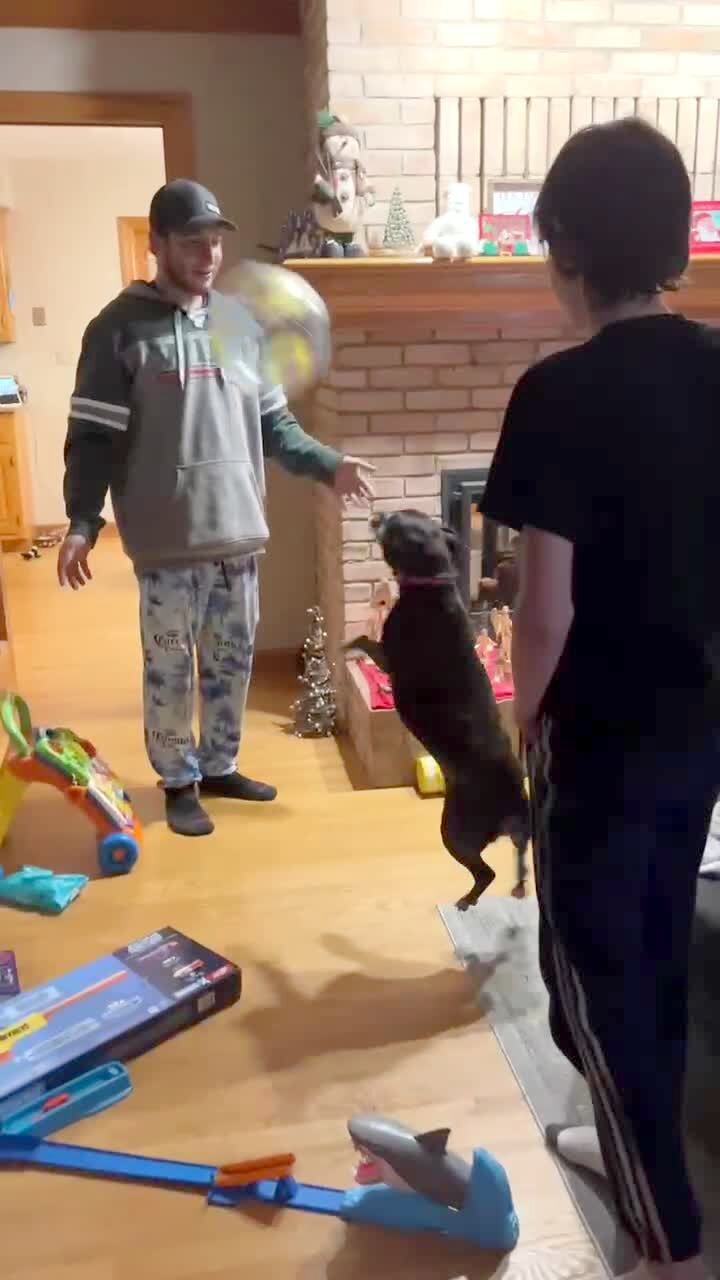 A man in a swimming pool in a yard throws a ball to a Boston Terrier dog outside the pool and the dog jumps up and knocks the ball into a toy basketball hoop.