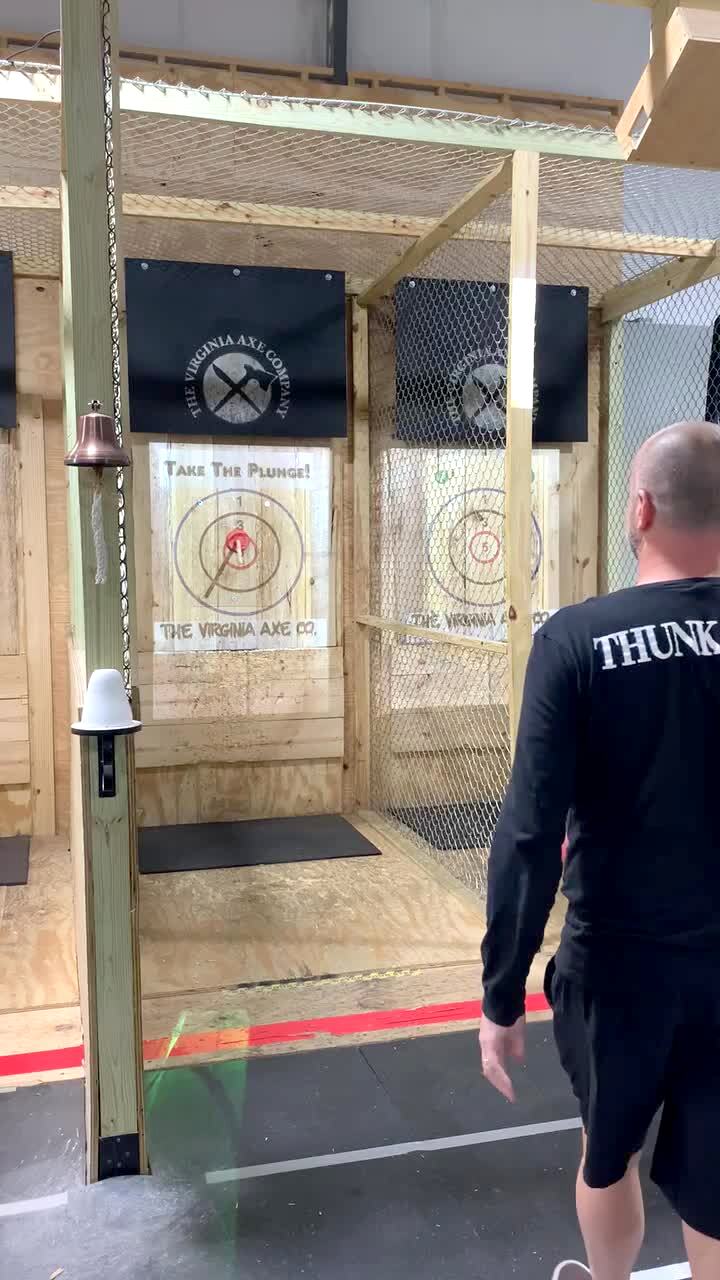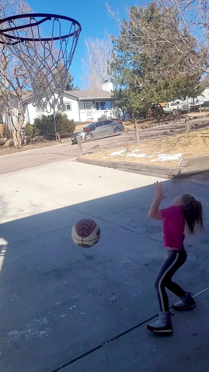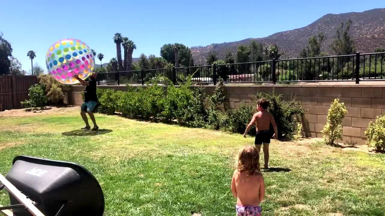 A man shoots a basketball at an inflatable basketball hoop in a yard and misses. Another man with the camera says "I've never seen so many misses". The man grabs a ball and throws it over his head and it goes in. Featured talent cleared only (boy and man without a shirt on).