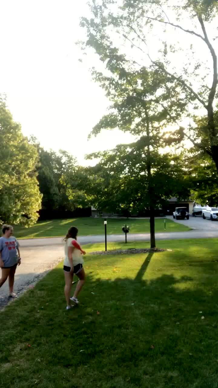 A teen girl swings a toy bat at a ball and misses several times, and then she tosses it over her shoulder and hits another teen girl in the head.