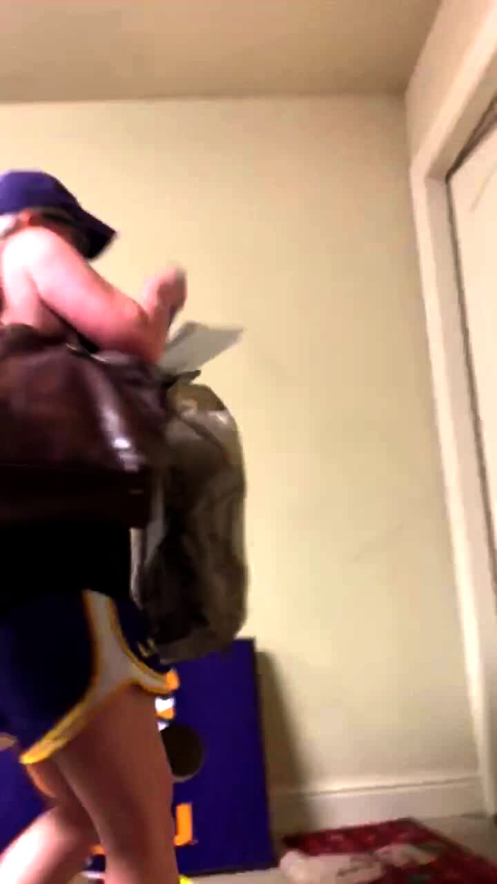A man scares a woman in the garage and she throws Pokemon cards at him.